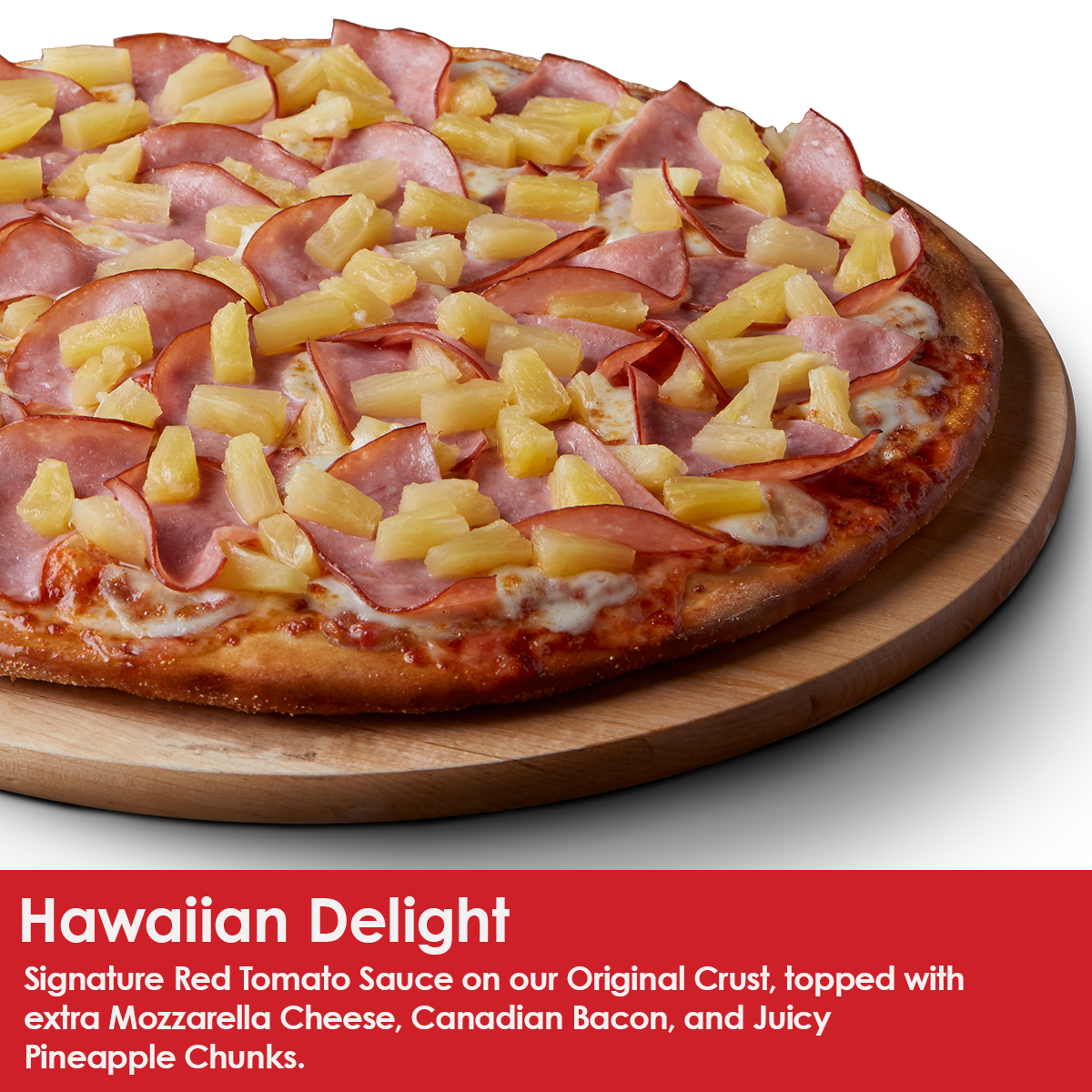 Signature red tomato sauce, 100% whole milk mozzarella, Canadian-style bacon, juicy pineapple chunks, and topped with extra 100% whole milk mozzarella.