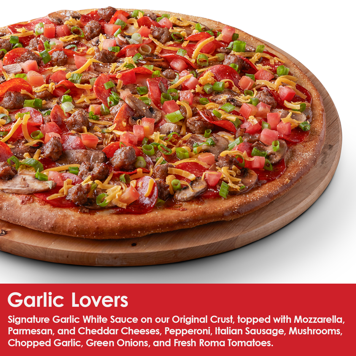 Signature white garlic sauce, 100% whole milk mozzarella, grated Parmesan, pepperoni, Italian sausage, fresh mushrooms, fresh chopped garlic, topped with cheddar cheese, chopped green onions, and fresh diced tomatoes.